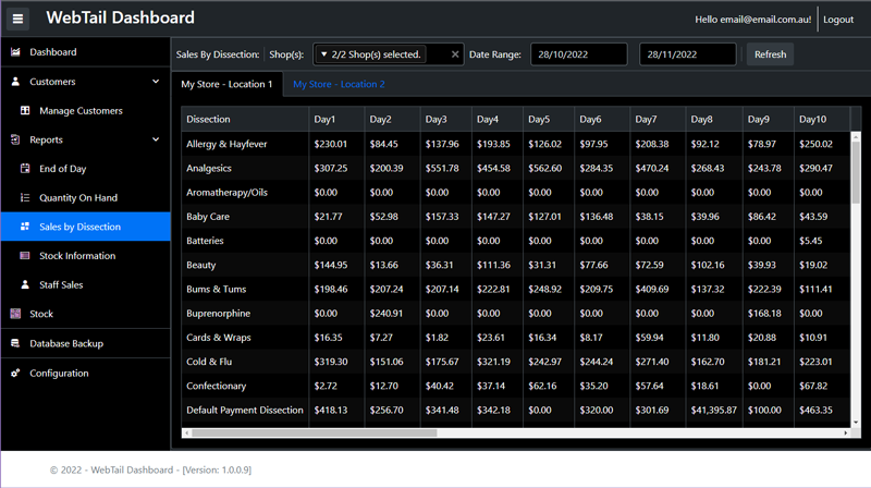 Find out which of your dissections are over or under performing, understand your sales by store or groups of stores. Select a date range and go! Not only do we provide this information directly from your stores when you request it we can aggregate it and provide cumulative breakdowns across all your stores.