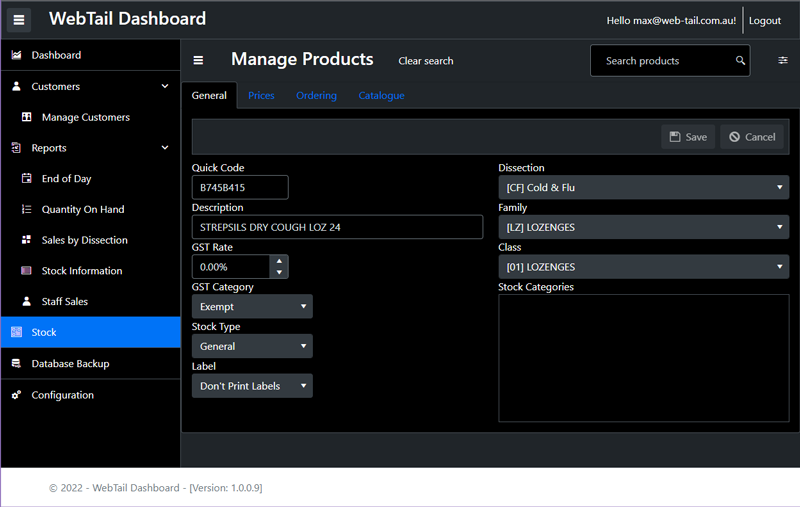 View and manage your stock through your online portal from anywhere in the world, just like if you were standing in your store. View live inventory figures and even manage you stock catalogue entries for your online store (if using the WebTail Sync-Tool).