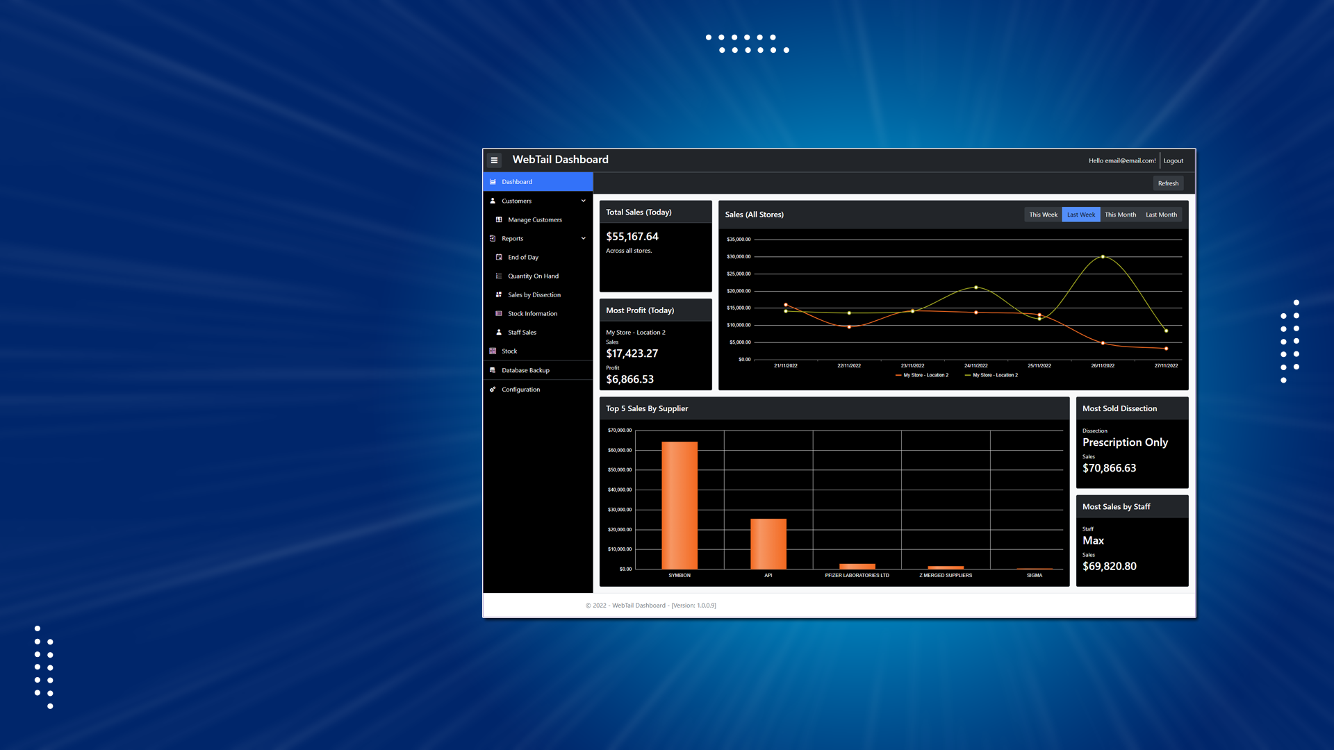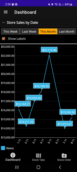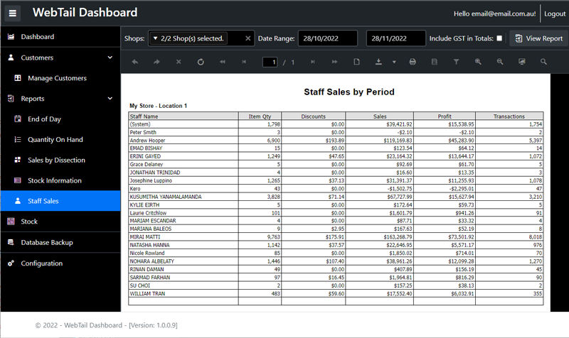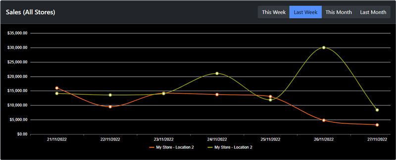 View real-time aggregated data of store(s) sales. With one quick glance find out how your store or multiple stores are performing, which dissections are making you money and which staff are underperforming.