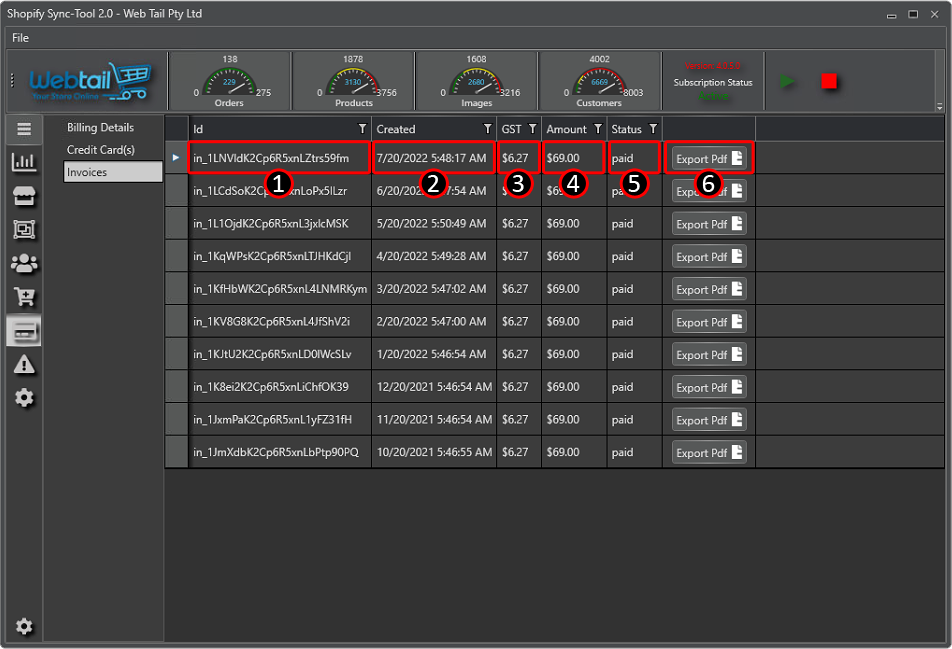 The invoices tab allows you to view and export previous payments/billing statements from WebTail for our services.